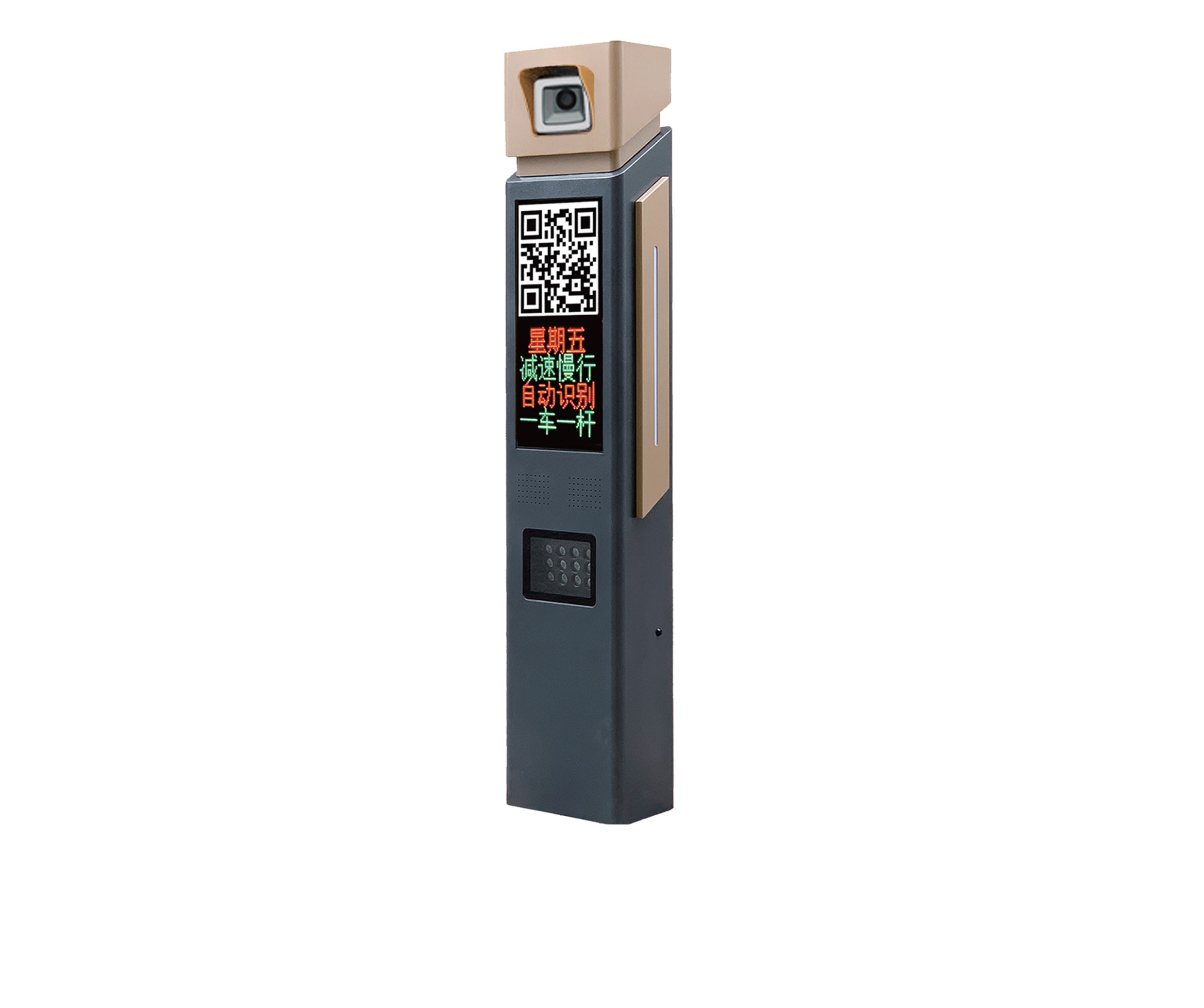 外壳整体尺寸:275mmx180mmx1400mm(宽x厚x高)两行显示,车牌号码、停车时间、收费金额以及广告信息等自带语音播报功能可选配AI云停车功能-