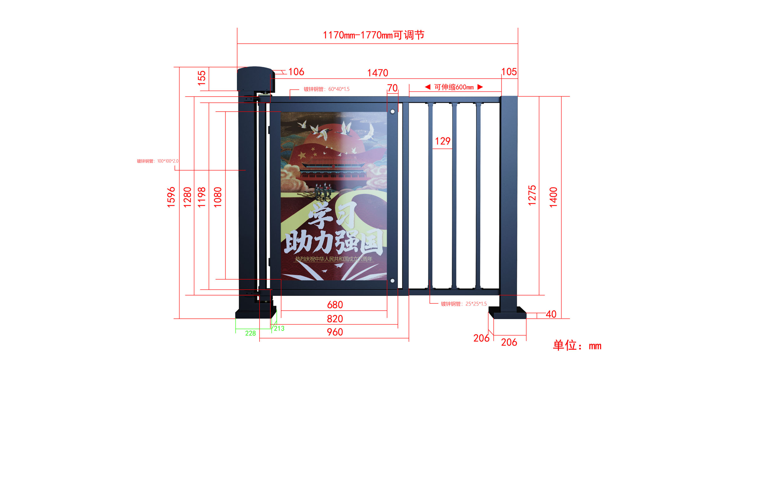 规格参数 产品尺寸:1800*213*1640- 额定功率:30W(接灯箱+25W)- 遥控控制功能:无线(选配)- 灯箱控制功能:时控- 电锁控制功能:有- 开门保持时间:1-99秒- 开关速度:1-9档可调(3-10秒)- 遇阻碍保护:遇阻停止/反转- 电源电压:城邦DC24V/6A- 通道宽度:1.2-1.77米可调-